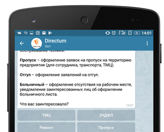 Через привычные мессенджеры Viber или Telegram все сотрудники могут подключиться к Directum Bot. С его помощью можно оформить заявление, направить заявку или запрос в другие отделы (например, если нужна справка из бухгалтерии), быстро ознакомиться с высланными приказами, нормативной документацией и др.