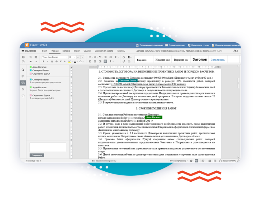 - Для того чтобы ускорить создание документа или согласование, сотрудники могут одновременно редактировать или рецензировать документ;