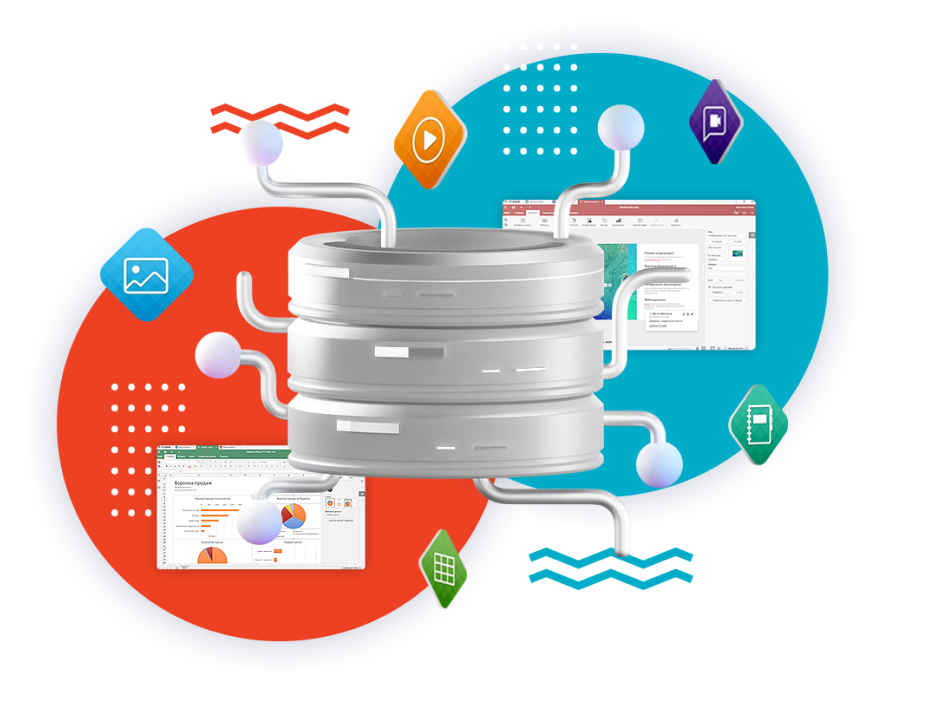 - Пользователи могут работать со всеми популярными форматами документов – текстовые файлы, таблицы, презентации, видео- и другие медиафайлы.