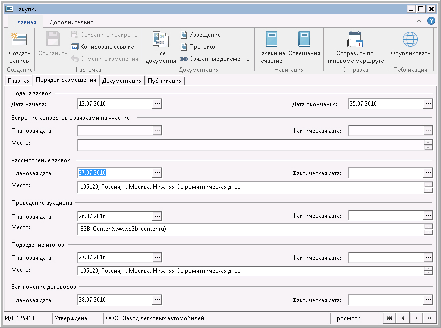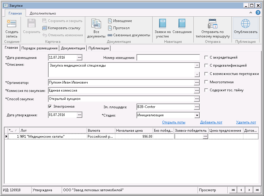 Внешне с точки зрения пользователя практически ничего не меняется, то есть он продолжает работать в уже привычном интерфейсе. Подготовка закупки к публикации сводится к заполнению необходимых полей карточки и прикреплению необходимых документов.