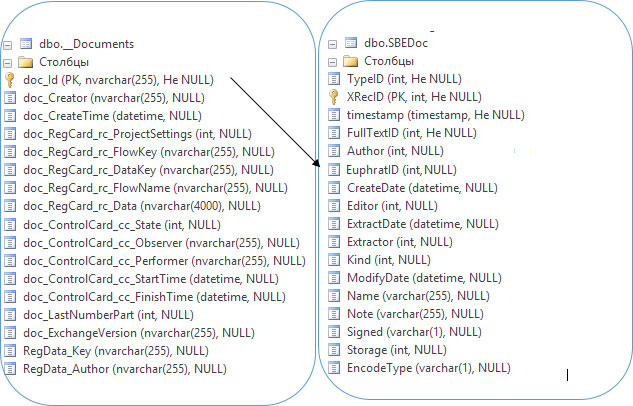 Связь между объектом «документ» в СЭД «Е1 Евфрат» и в СЭД «Directum» в таблицах БД.
