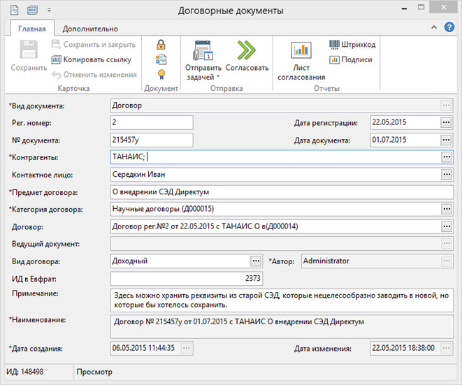 Пример карточки документа, перенесённой из СЭД «Е1 Евфрат». Как можно видеть, при переносе документа также создаются и записи справочников.