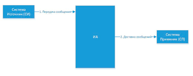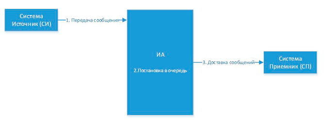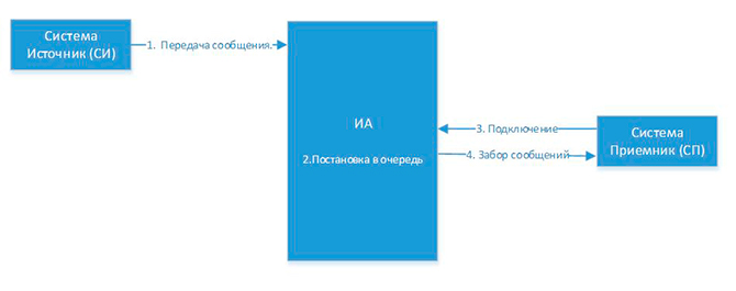 Система-источник передает сообщение ИА, указывая тип источника события. ИА определяет каким системам-приемникам необходимо осуществить доставку данного сообщения, ставит в очередь сообщения для каждой из систем-приемников. Системы-приемники подключаются к ИА и забирают имеющиеся для них сообщения.